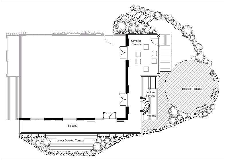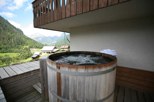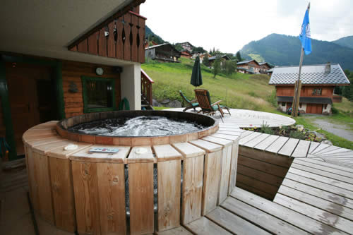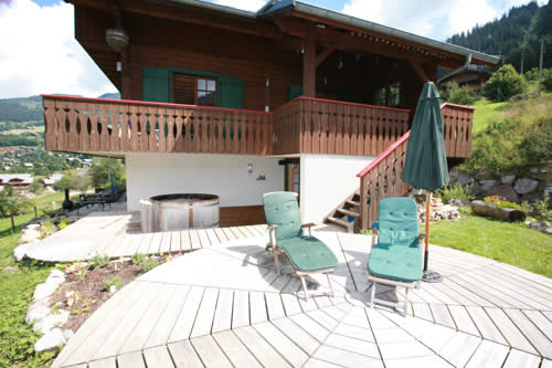 Off the kitchen area is a covered terrace with table and chairs. This leads to the balcony area with French doors to the dining area. The terrace has a gated staircase giving access to the lower areas. A large circular decked area provides ample space for eating, relaxing and sunbathing. Partly sunk and level with the ground floor is the hot tub area. This is again a decked area with integral lighting where you will find the circular Canadian hot tub.